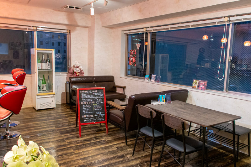 バーではありますが、ステンドグラスのライトが照らす明るい雰囲気で、気軽に利用できるのが魅力。店内にはカウンター4席とテーブル12席があり、ゆったりくつろげるソファ席も用意されています。
