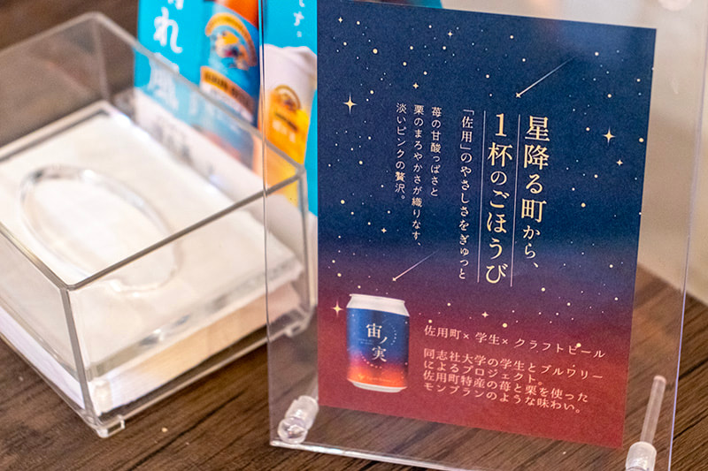 クラフトビールは、瓶では自家栽培の有機米「ヒノヒカリ」を使った神戸市西区の「KOBE MOON BREWERY」のもの、生では佐用町と大学生たちが手がけた「宙ノ実(苺と栗のビール)」をスタンバイ。地元にゆかりのある一杯に出合えます。